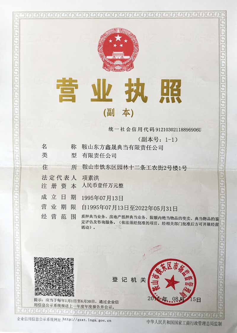 鞍山東方典當(全稱:鞍山東方鑫晟典當有限責任公司)是經國家商務部批準,在鞍山市工商行政管理局注冊的一家具有雄厚資金實力,從事房產、有價證券、實物等一切典當法規范圍內質押典當業務,具有獨立法人資格的金融企業。